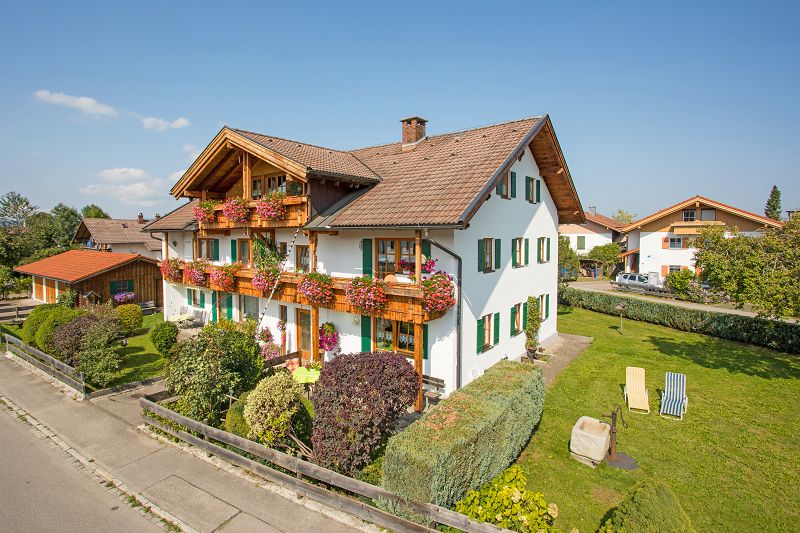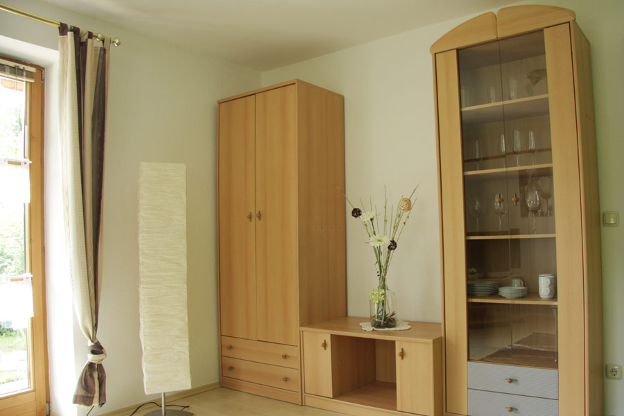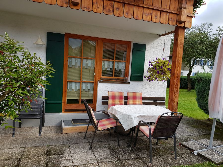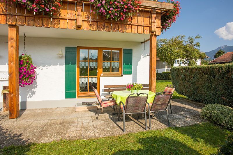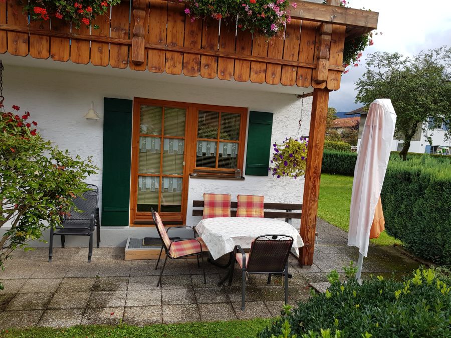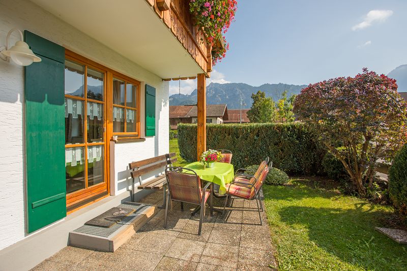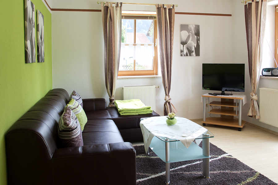 Das sehr geräumige Wohnzimmer mit Eckcouch, Flachbildfernseher und Radio lädt nach einem ereignisreichen Tag zum Entspannen ein. Über das Wohnzimmer kommt man auf die ruhige Terrasse, mit herrlichem Blick auf den Säuling.