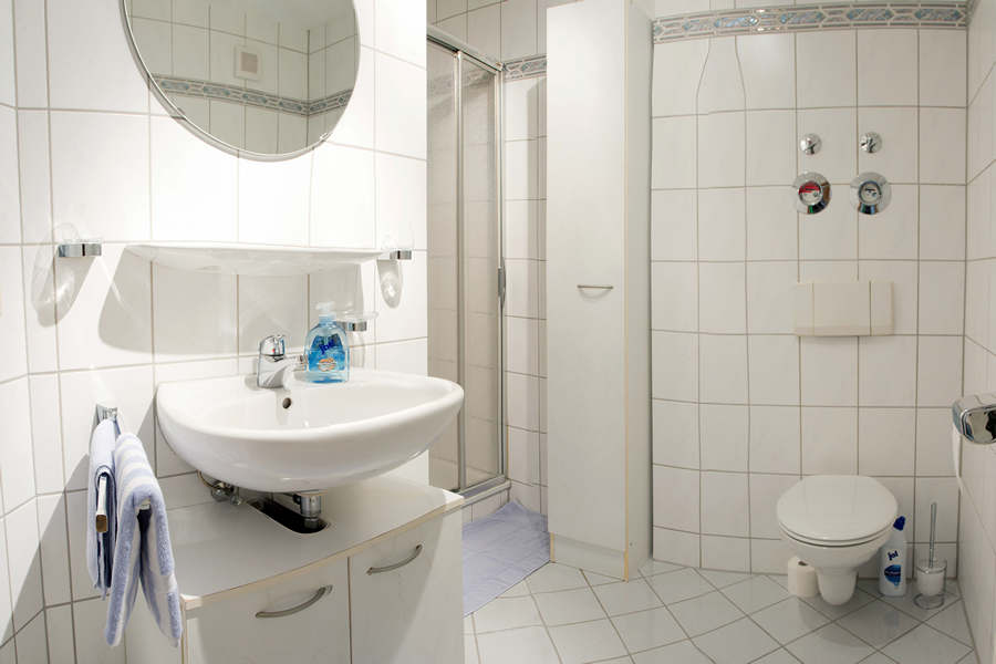 Das Bad ist mit Dusche, WC, Waschbecken, einem Föhn und diversen Badmöbeln ausgestattet. Handtücher werden von uns gestellt.